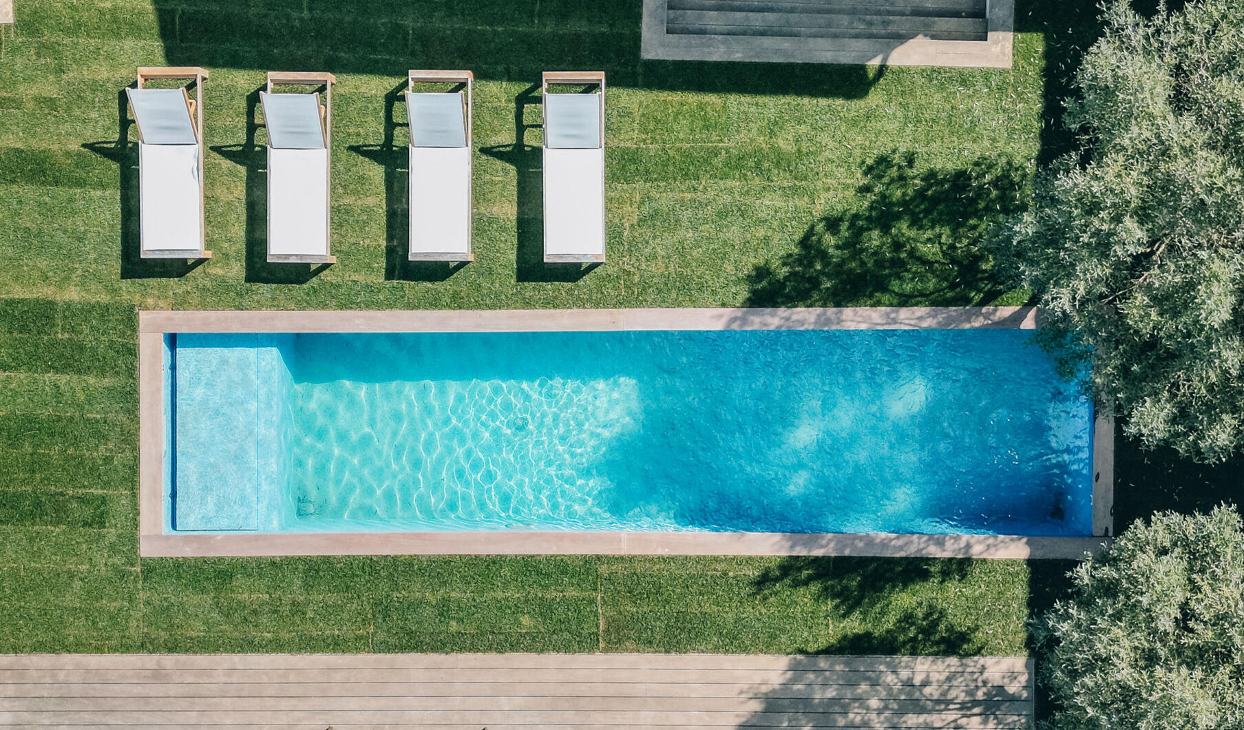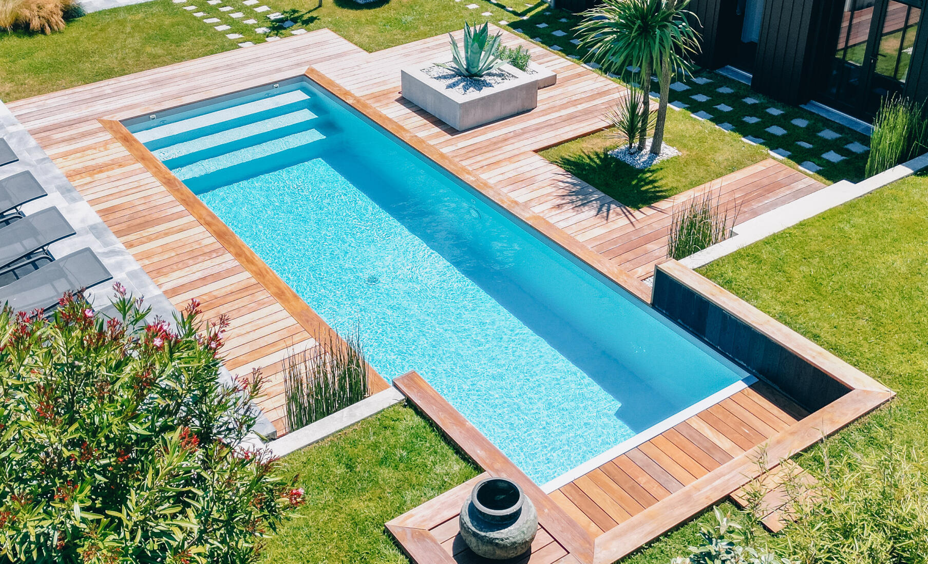L'intégration paysagère totale : Affleurant le sol, la piscine enterrée disparaît dans le jardin et crée une continuité visuelle parfaite avec les abords : plage, terrasse, végétation.