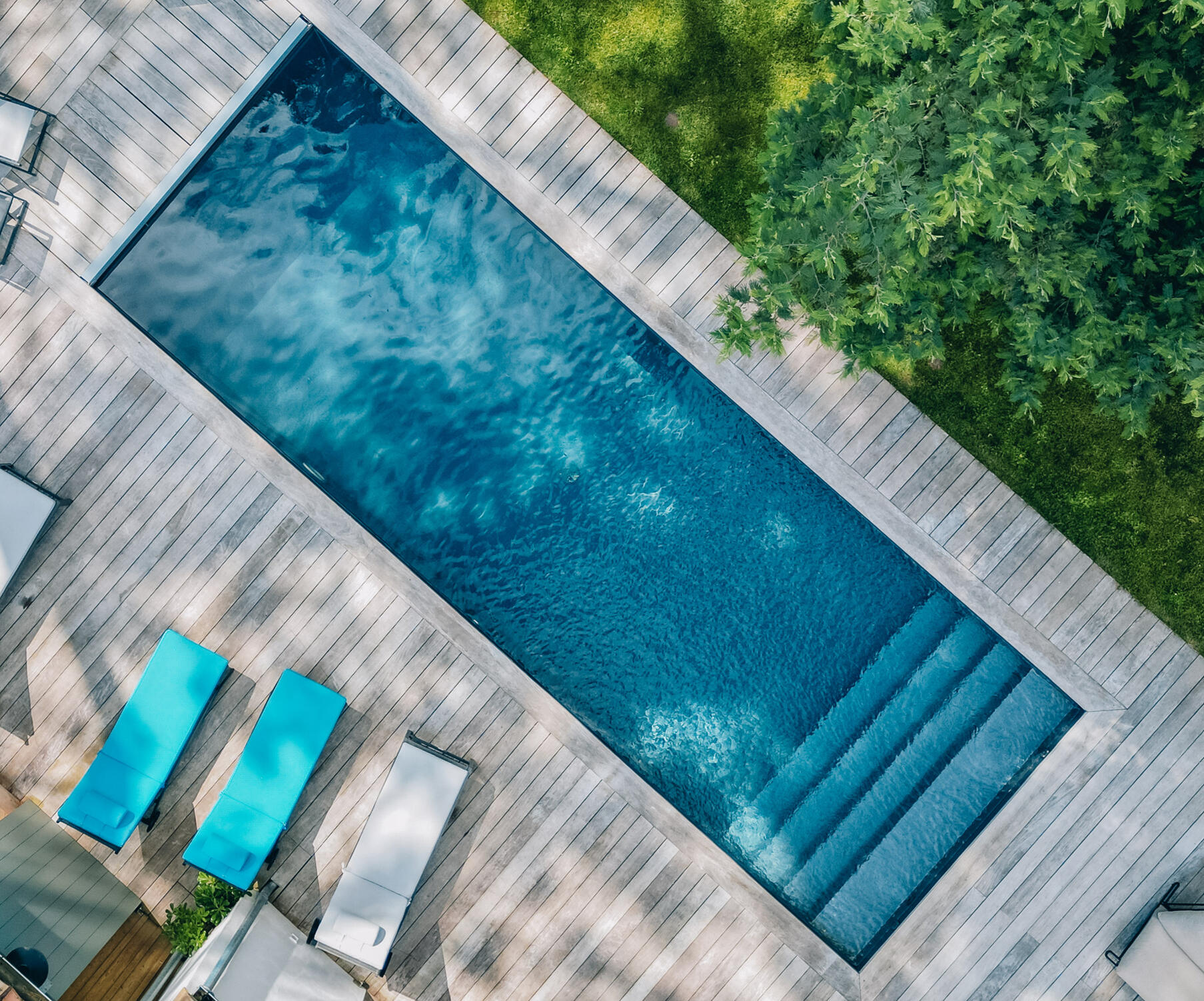 L'intégration paysagère totale : Affleurant le sol, la piscine enterrée disparaît dans le jardin et crée une continuité visuelle parfaite avec les abords : plage, terrasse, végétation.
